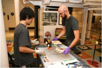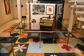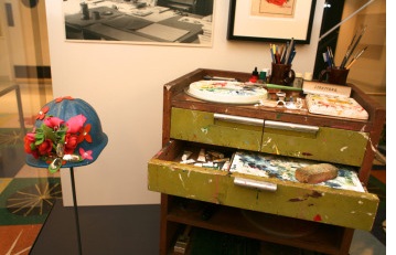 There is a hard hat, with decorations inspired by Mary Blair’s art and designs, created and given to her by fellow artists at WED (later called Walt Disney Imagineering) during the building of the model for "It’s a Small World". There also is a portrait of her drawn by Jack Miller, who traveled with Walt, Mary Blair, and others on the 1941 Good Neighbor tour to Latin America. In the photograph you can see our preparators, Ben Peters and Issey Honton, discussing and installing the artifacts.