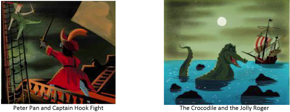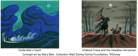 Mary and her husband, Lee Blair, also an artist, traveled with Walt to South America. John showed us a treasure trove of her paintings from that trip. Brilliant colors lay on a background of black. Her artwork can be seen in the movie The Three Caballeros. Her three big movies were Cinderella in 1950, Alice in Wonderland in 1951, and Peter Pan in 1953. She also painted for the movies Johnny Appleseed (a segment of the 1948 feature Melody Time), So Dear to My Heart, and The Adventures of Ichabod and Mr. Toad.