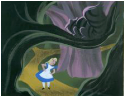 [Images above: 1) Alice and the Cheshire Cat, concept art by Mary Blair. Collection Walt Disney Family Foundation. ©Disney. 2) Mary Blair at work in her studio. Photo by Lee Blair.]