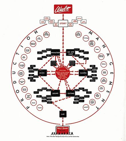 A third example is a representational flow chart of the departmental organization at the Disney studio. Created for employee familiarization on the new lot in Burbank, the chart shows the flow of operations from one department to the next. The Story Department is represented prominently at the top of the chart, and Direction is shown as the center hub. Animation, Ink and Paint, and other departments exist on spokes around Direction. The chart is from an employee handbook from 1943 for the Disney Studio in Burbank.