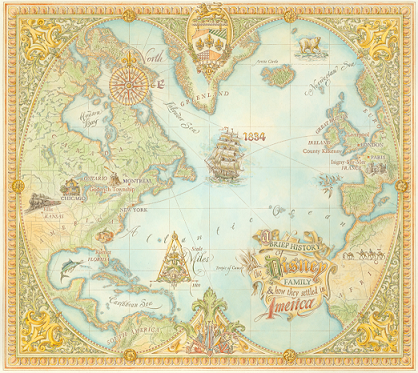 Short descriptions appear alongside the most important locations in Disney family history, and a dotted line illustrates movements of the Disney line tracing back to I’Signy-sur-Mer in northwestern France.