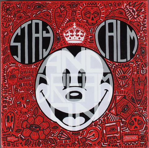 Tennessee Loveless is an artist currently based in Chicago, Illinois. Being colorblind, Loveless understands hues in a conceptual way, often making choices based on the fundamentals of color theory, word association, and color psychology, instead of considering the color itself. He has created officially licensed art for both The Walt Disney Company and Warner Bros. Perhaps most notably, his 10x10x10 series, which is based on 100 silhouettes of Mickey Mouse, explores the history of the iconic character and brings added global, societal, and personal context to the imagery. His works, Monochrome Throne (2013), Mickey Modified Mondrian (2016), Stay Calm and Scribble On (2018) are on display in our latest exhibition, Mickey Mouse: From Walt to the World.