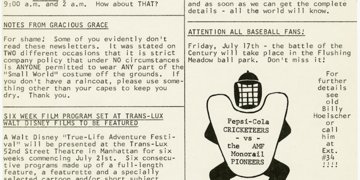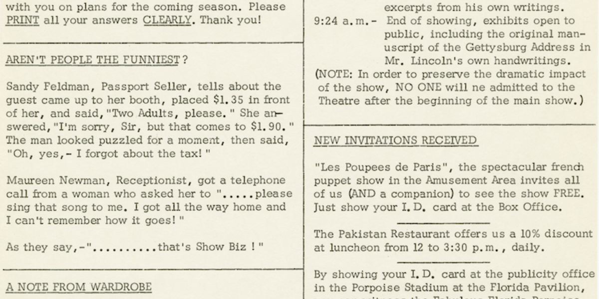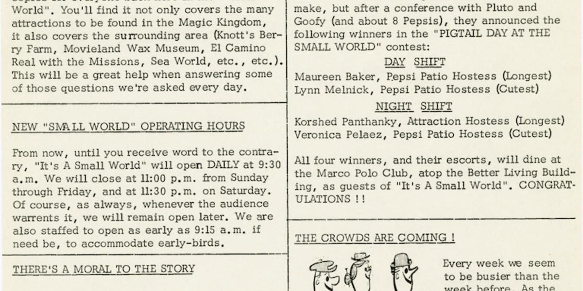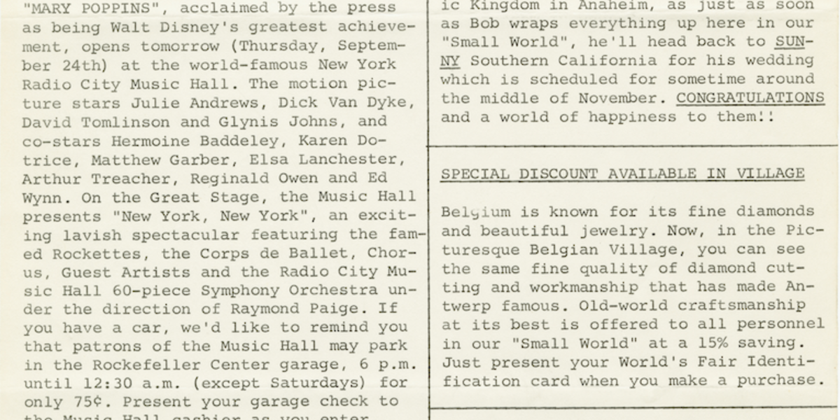 That’s why I love reading these newsletters from the original it’s a small world exhibit at the 1964/65 New York World’s Fair. I feel like a time traveler visiting those cast members who helped guide the world’s experience of this iconic attraction for the first time. Here you’ll find the results of a pigtail contest, a birth announcement, which side of the costume Pepsi-Cola name tags were to be worn, news about Mary Poppins(just before its spectacular premiere in theaters), and an invite for small world cast members to preview another famous Walt Disney fair exhibit, Great Moments with Mr. Lincoln