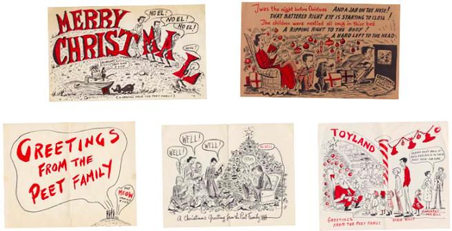 "Disney Artists' Holiday Wishes," a special collection of personal Holiday Greeting Cards—created by Disney Studio animators, comic strip artists, story men, a "Mooseketeer," and even the creator of the voice of Donald Duck—is our special holiday exhibition, and will run through December 31 this year. The delightful holiday exhibit features more than 50 hand-drawn cards, created from 1937-1970, by many of the most creative and well-known Disney talent. Today, we'd like to highlight the WDFM's Communications & Marketing department's favorite cards, those from artist Bill Peet!