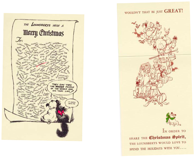 "Disney Artists' Holiday Wishes," a special collection of personal Holiday Greeting Cards—created by Disney Studio animators, comic strip artists, story men, a "Mooseketeer," and even the creator of the voice of Donald Duck—is our special holiday exhibition, and will run through December 31 this year. The delightful holiday exhibition features more than 50 hand-drawn cards, created from 1937-1970, by many of the most creative and well-known Disney talents. Today, we'd like to highlight The Walt Disney Family Museum Collections department's favorite cards, those from animator John Lounsbery!