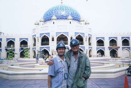 Images above: 1) Rolly Crump (left) with Walt and the Tower of the Four Winds model, 1964. © Disney. 2) Chris and Rolly Crump in Tokyo at TokyoDisney Sea (Arabian Coast), c. 2001. "Rolly told me, 'You know, Walt would really love this place!'" Chris says. © Chris Crump. All rights reserved.
