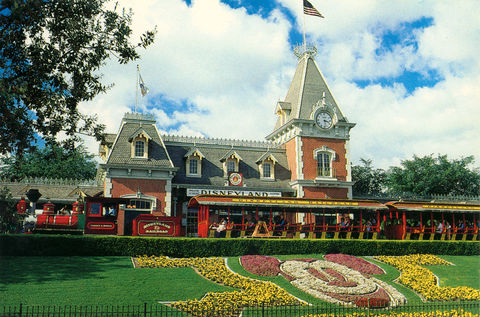 - Postcard of Mickey Mouse floral display in front of Main Street U.S.A. train station at Disneyland park, Disneyland Resort; collection of Walt Disney Family Foundation; © Disney