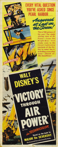 On Sunday, May 22nd, The Walt Disney Family Museum will present a rare screening of Walt Disney’s 1943 Technicolor® animated feature film, Victory Through Air Power, based on the 1942 book by Alexander P. de Seversky. Prior to the screening, our consulting historian Paul F. Anderson will offer a visual presentation on the making of the film, and the resulting impact the film had on Allied war strategy. The following overview of this unusual film was written by Dr. Richard Shale.