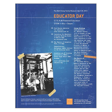 We’re celebrating a day of STEAM-powered education at The Walt Disney Family Museum on Saturday, April 20! By adding the arts (A) to STEM (science, technology, engineering, and math), we want to help teachers show students that STEM can be creative and fun. Why STEAM? Well, Walt built Disneyland using the power of STEAM—that’s what Imagineers do. So while combining STEM and the arts is suddenly a hot topic in educational policy circles, it’s business-as-usual for those who follow in Walt’s footsteps.