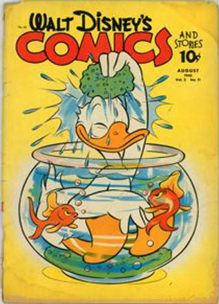 The forties saw the emergence of the Disney comic book line, and at the forefront of this success was Donald Duck. Not only did he receive his own comic book title, starting in 1942 with Four Color #9 “Donald Duck Finds Pirate Gold” but he became the key piece to Walt Disney Comics & Stories, which went on to become the best selling comic book of the late 1940s and into the 1950s. But most of all, what he will probably be remembered for in the world of comic books is helping to jump start the career of his good friend and pal, Carl Barks (aka the “good duck” artist).