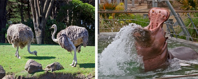 Here is a little known fun fact about the “Dance of the Hours” segment in Disney’s Fantasia—the ostriches pirouetting in the opening of the piece are performing in drag!  While their bows, long eyelashes, and ballet slippers suggest a feminine side, their black feathers give them away!  Only male ostriches have black feathers, while females are colored a brownish-grey.  Come and see a female ostrich for yourself at the San Francisco Zoo or better yet, sign up for one of our Early Bird Tours and have a close encounter with one!  Another member of the cast from “Dance of the Hours” that you can see in person at the San Francisco Zoo is a Nile hippopotamus.  While the Zoo’s hippo, “Brian Wilson,” doesn’t dance en pointe, he does perform many acrobatic rolls and leaps in his pool—all the better to splash you!