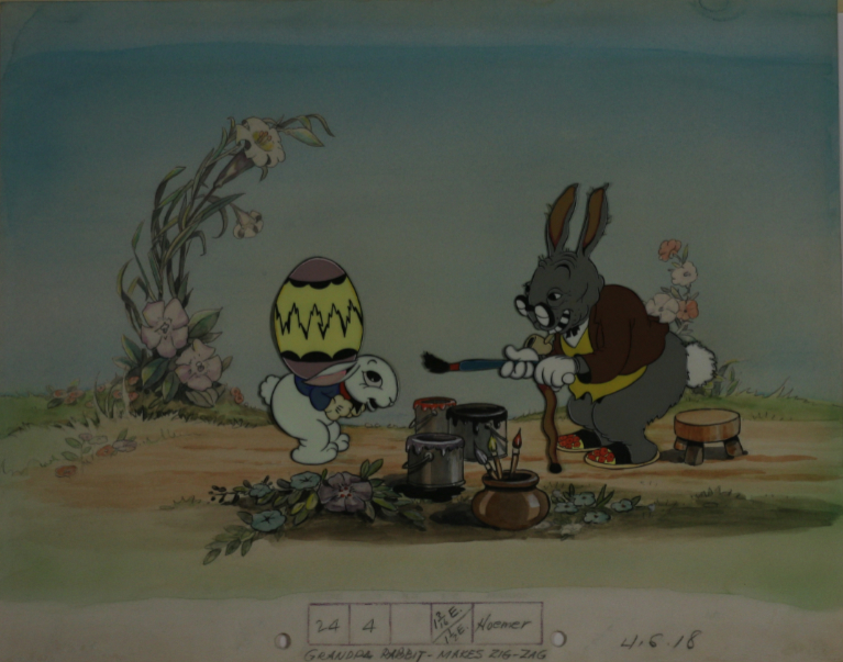 In celebration of Easter today, we'd like to share this cel-setup from Walt Disney's 1934 Silly Symphony "Funny Little Bunnies"! Excerpted from Russell Merritt and J.B. Kaufman's Book, Walt Disney's Silly Symphonies: A Companion to the Classic Cartoon Series, this short subject cartoon features a "tour of a meadow filled with rabbits readying their wares for Easter. A group of confectioners prepare candy eggs, chocolate rabbits, and other delicacies while an assembly line of hens produces a supply of fresh eggs, painted by rabbits with colors taken directly from the rainbow. The visit ends with another crew rabbits loading giant Easter baskets with their brightly colored cargo." "Funny Little Bunnies" ended up winning the gold medal award for Best Animated Film in 1934 at the Venice Film Festival.
