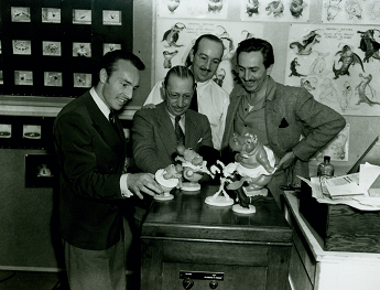 Fantasia was the culmination of years of experimentation and imagination. With Fantasia, Walt had invited many of the notable figures in classical music to participate or contribute to the film. In December of 1939 with the production of Fantasia moving full steam ahead, Igor Stravinsky made a visit to the studio. On this visit he brought a friend to hear his soundtrack for “Rite of Spring”--his friend was Mr. George Balanchine. As other VIP visitors to the studio before him, Balanchine got a special behind the scenes look at Fantasia. He posed for photographs with character model statues of Hyacinth the Hippo, met with animators, and heard the beautiful sounds of Fantasia. For Balanchine, that is as close as he would get to being a direct part of Fantasia. He would never be formally involved in the creation of Fantasia, like Stravinsky or Leopold Stokowski, but like many other artists of the time, he would serve as inspiration. Specifically it would be the Water Nymph ballet choreography he created in 1938 for the film Goldwyn Follies that would serve as inspiration for Fantasia's seventh segment: "Dance of the Hours".