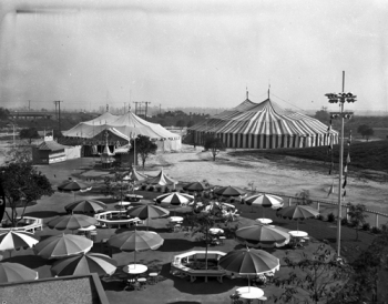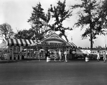 The very name evokes thoughts of the Christmas season, but in reality, Holidayland  came to life in the summer of 1957 as a picnic and play area for groups and special events. With a private entrance to Disneyland, a regulation softball diamond, horseshoe pits and volleyball court, Holidayland featured—direct from its starring role in Disneyland’s Mickey Mouse Club Circus—the “world’s largest candy-striped circus tent.”