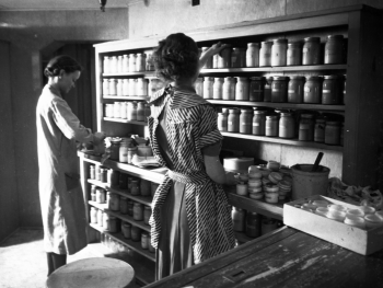 Guests at the Look Closer presentations also appreciated hearing about the two “Tea Times” women in Ink and Paint enjoyed daily- breaks during which a uniformed maid served tea and the occasional special treat such as Lorna Doones.  In her lengthy article, Zohn comments that these women always dressed fashionably, coming to work in dresses, pearls and heels or high-waisted pants and slip-ons, which were made acceptable by Katherine Hepburn.  Over time they were required to wear silky pongee smocks to prevent particles from their clothing from falling onto the cels.  Thin, white cotton gloves were also worn to protect the cels; the women customized these gloves by cutting off the thumb and first two fingers on their working hand.