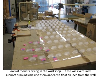 For a bust of Lincoln (from the case about Great Moments with Mr. Lincoln) Neil carefully carved a dense foam to the exact shape of the bust’s interior. This support was secured to the pedestal on which the bust sits (and the pedestal is secured to the bottom of the case) ensuring that Lincoln will never tip over and you will never see the foam. There was no inner cavity where we could hide the metal support needed to make sure Hyacinth, the hippo from Fantasia, was not going to dance away and break in an earthquake. So we made the support as small as possible and Gina, the master color matcher, painted it the same color as the statue. To make all the drawings in our Silly Symphonies case float 3 inches from the wall Denise designed a complex metal and plastic support that not only achieved the desired effect, but was also adjustable so when it came to installing the case and trying to get all 41 drawings to line up just right, we could raise one a little bit, lower another just a tad, or move the next one to the right or left.