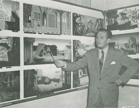 Photograph; Walt Disney reviews Sleeping Beauty backgrounds by Eyvind Earle, c. 1950; collection of the Walt Disney Family Foundation, Gift of Ron and Diane Miller, © Disney