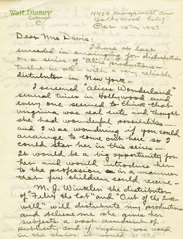 Walt corresponded with Winkler before he moved from Kansas City to Hollywood in July 1923, then contacted her again a month later to sell her on the idea of the Alice Comedies series. On stationery with “Walt Disney, Cartoonist” letterhead, he wrote, “In the past, all cartoons combining live actors have been produced in an amateur manner… It is my intention to employ only trained and experienced people for my casts and staff that I may inject quality humor, photograph and detail into these comedies.” On October 15, Winkler responded, “If your comedies are what you say they are and what I think they should be, we can do business.”