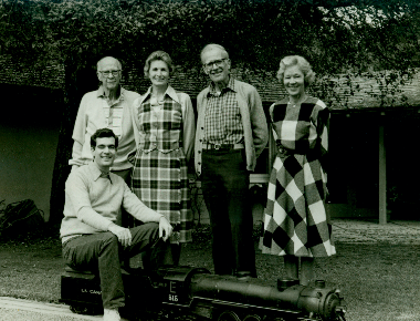 [Left to right: Ollie Johnston, Jeanette Thomas, Frank Thomas, Marie Johnston, and John Canemaker (on the train). December 21, 1983. Courtesy Walt Disney Family Foundation.]