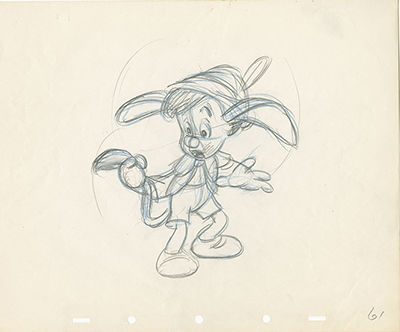 In 1937, as he readied the release of Snow White and the Seven Dwarfs, Walt Disney had his story team begin development on what would become his second feature animated film, Pinocchio. Based on the novel written by Carlo Lorenzini under the pen name Collodi, the puppet of the book was a brash, over-confident, obnoxious character who was always purposely causing mischief. When Walt first began working on his film version, he kept the character as Collodi created him, hoping that the character’s brashness would come off as appealing. The early designs for the character (particularly as seen in the earliest sketches by Albert Hurter) reflected this personality.
