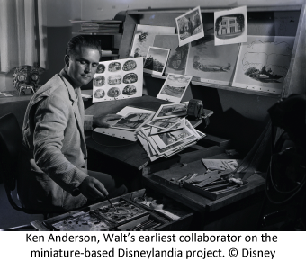 It is believed that Walt first seriously worked with miniatures when he helped build a Lionel train layout for his nephew, Roy E. Disney, in the early thirties, working intently on the surrounding landscaping and structures for the train track.