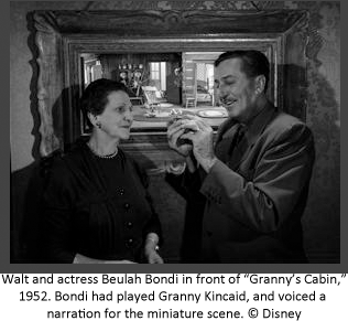 Walt spent countless hours carefully constructing the first of his tiny tableaus. The first scene, entitled “Granny Kincaid’s Cabin” was based on a set from his live-action feature, So Dear to My Heart (1949).
