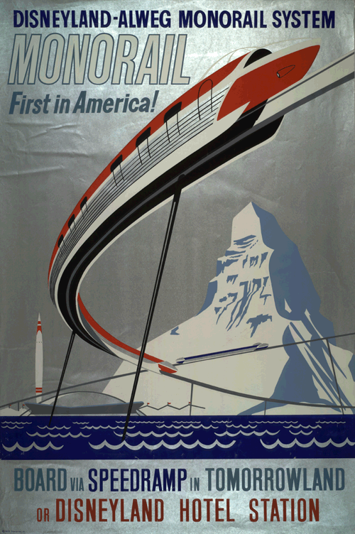 My friend Alan Hess, author and respected authority on all things mid-century modern, writes “The bold primary colors, clean open compositions, and strong abstracted shapes seen in the faux-travel posters lining the ticket kiosks and entry tunnels to Disneyland could also be seen in the popular media everywhere, from magazine advertisements to animated cartoons (see Chuck Jones' Bugs Bunny, Jay Ward's Rocky and Bullwinkle, and Terrytoons' Tom Terrific cartoons.) Disneyland, and especially Tomorrowland, not only reflected this trend, its design was the very embodiment of the American public's optimistic hopes for a progressive Modern future, to be experienced in everything from commercial space travel to picture phones hanging on your kitchen wall.”