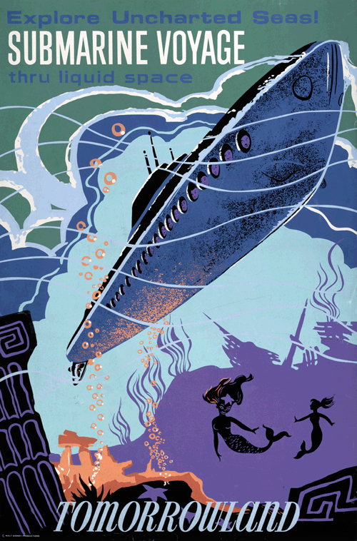 Those posters, which were basically advertisements for the rides that were inside the park, are wonderful testaments to that era. They are graphic reminders to all of us of a certain age of the Disneyland of our childhood. From the submarine ride to the Monsanto Trip Through Inner Space to the Rocket to the Moon, they all capture the mid-century modern esthetic in their design and their whimsy. They also offer an amusing look into what we thought the future would be like. Well, now that that future is here, am I the only one still wondering where my jet car is?