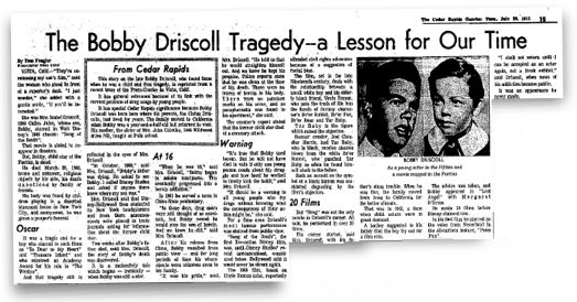 The motion picture industry has long had a disquieting reputation for chewing up and spitting out many of its juvenile performers and unfortunately the Walt Disney Studio is not without its own tragedy in that regard. The Bobby Driscoll story could be easily considered a textbook example of the rise and ultimately fatal fall of a child star. It was a story that began happily against the backdrop of 1940s Hollywood, but ended sadly in an abandoned New York City tenement building two decades later.