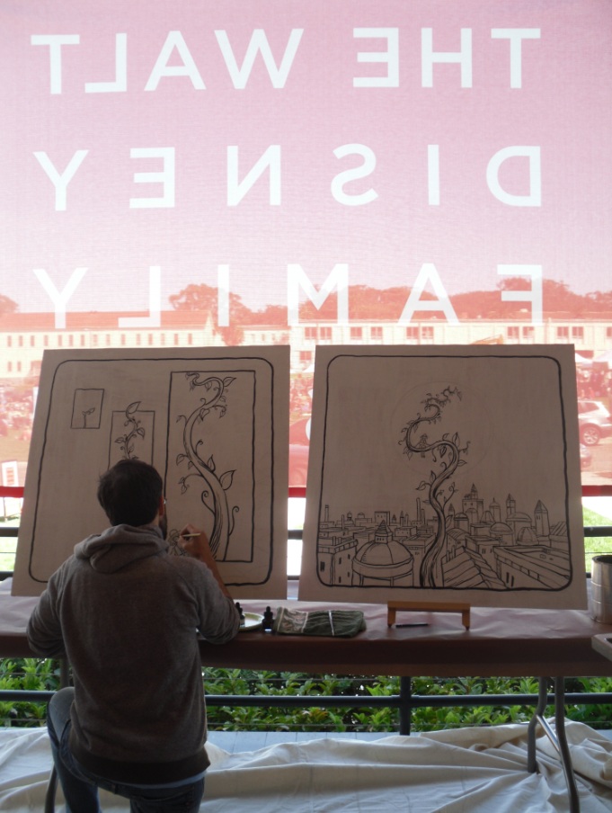 This month in Open Studio, artist Andy Gouveia created a story sequence on six large wood panels on the front porch of The Walt Disney Family Museum. The panels featured a series of line work illustrations telling an adapted version of the fairy tale Jack and the Beanstalk. The series of illustrations served to focus the viewer’s attention to the key storytelling moments of the plot, and encouraged the viewer to imagine one continuous story from the first panel to the last.