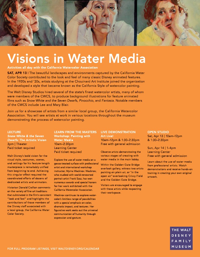 During the weekend of April 13-14, The Walt Disney Family Museum is offering an unprecedented array of programming to celebrate the end of our first major exhibition, Snow White and the Seven Dwarfs: The Creation of a Classic. Artists from the California Watercolor Association have been invited to demonstrate their craft in various places throughout our museum on Saturday, the 13th. In addition to working in the Main Lobby, on the front porch, and in Gallery 8, five of the artists will also be leading a Learn from the Masters workshop and the Open Studio experiences.