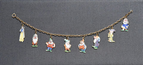 Luckily for Walt, Lilly was always a supportive presence in his life; even if she wasn’t showy about it, she found ways to encourage him and assuage his worries. Photographs of the couple at the premiere of Snow White and the Seven Dwarfs at the Carthay Circle Theatre in December of 1937 are on display in Gallery 4, and in those photographs you’ll see that Lilly is wearing a very special bracelet—a Cartier bracelet, with charms that feature the likenesses of Snow White and each of the Dwarfs.