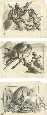 The charcoal pieces are framed in black borders, highlighting the cinematic potential of their composition. Though it’s not likely that Scott worked on any films before her time at Disney’s, her work demonstrates an incredible mastery of staging, lighting, and camera placement. Like a cinematographer, she places her characters dramatically in a symbolic clash between the elegant deer and ferocious dogs. There is something classical to the poses, as if they are statues of antiquity from Greece or Rome, their muscularity accentuated to the extreme. There is a stretching of time in each drawing, and we can almost feel the strength emanating from the paper.
