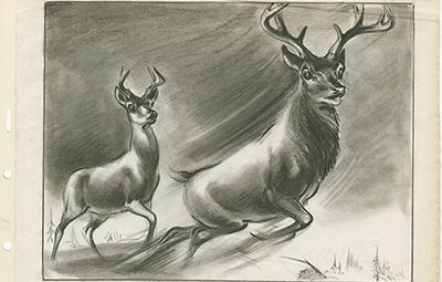 Arriving at the studio in 1938, she was assigned to the story department and began work on Bambi. She joined fellow artists like Mel Shaw and Marc Davis in field trips to the zoo, applying her passion for drawing animals. Almost immediately, her striking charcoal studies of the powerful sequence where Bambi battles a pack of hunting dogs caught the attention of Walt and the production team. As Frank Thomas and Ollie Johnston described, “A startling moment for us came when we saw Retta Scott’s amazing sketches of the vicious dogs…”