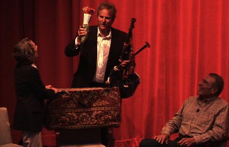As Jeff Kurtti thanked the panel for their memories, Laurence Boag spoke up, “I have one more surprise for you.” Laurence retreated backstage and emerged carrying Wally Boag’s original Traveling Salesman carpetbag, complete with gunpowder, magic flowers, and a bag of his lima bean “teeth,” In addition, he carried Wally’s beloved bagpipes. “I want to present this to the Millers and to The Walt Disney Family Museum.” The audience rose to its feet with applause, and a few tears were shed as Diane thanked Laurence for his generous gift “What treasure!” Diane said, “and the audience sensed it. They will find their place of honor in the Museum.”