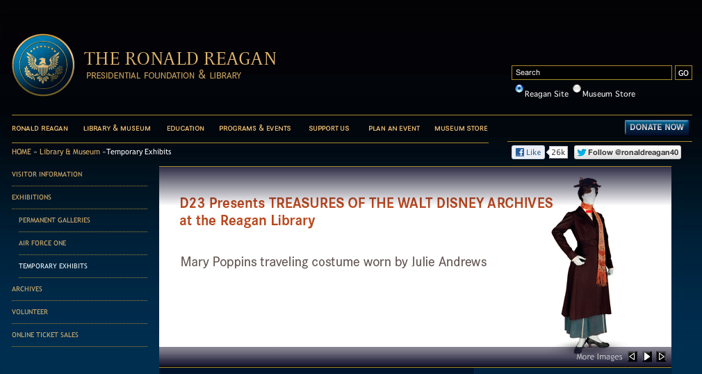 D23: The Official Disney Fan Club and the Ronald Reagan Presidential Foundation and Library are proud to announce D23 PRESENTS TREASURES OF THE WALT DISNEY ARCHIVES, coming to the Reagan Library in July of 2012. At 12,000 square feet, this is the largest exhibition ever curated by the Walt Disney Archives and the largest temporary exhibit ever housed at the Reagan Library. From Oswald the Lucky Rabbit and Mickey Mouse to Captain Jack Sparrow and Captain America, the exhibition features more than 500 artifacts from nearly nine decades of Disney history – over 50% of which have never been seen by the public – including models, props, costumes, set pieces and artwork from throughout Disney history.