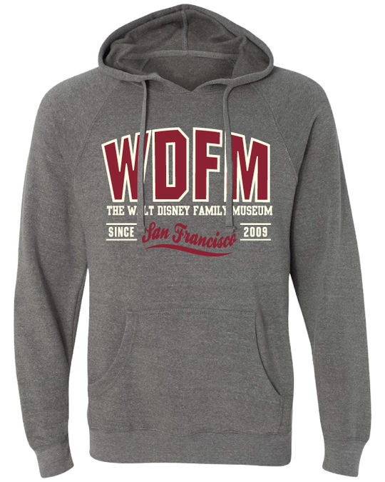 Exclusive to the Walt Disney Family Museum, this hooded sweatshirt features WDFM San Francisco in embroidered varsity-style lettering in heather grey.