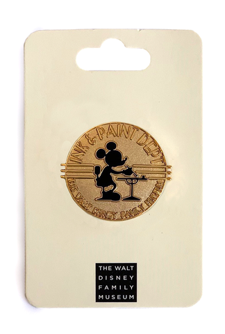 Exclusive to The Walt Disney Family Museum, this pin features Mickey Mouse with celebratory Ink & Paint Department imagery. Pin is black on a gold background, Includes Mickey head icon pin-back.