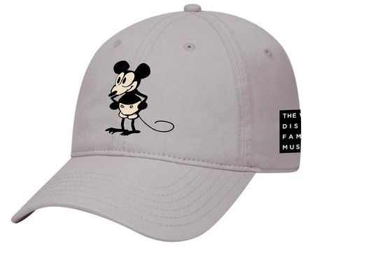 Exclusive design for The Walt Disney Family Museum. This grey baseball cap features the museum’s logo on the side and an embroidered sketch of the earliest known drawing of Mickey Mouse, dated from 1928 and on display in The Walt Disney Family Museum’s galleries. This cap is 100% pre-washed cotton with a curved bill and an adjustable backstrap. Also available in true red.